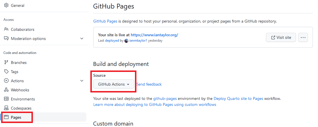 A better method that I am using is based on GitHub Actions, but doesn’t use the workflow provided by Quarto. Instead it’s based on a GitHub template workflow for publishing static content.